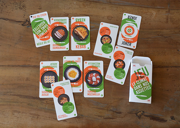 Jeu de 34 cartes, étui et guide : outil pédagogique pour les élèves des écoles hôtelières, pour prendre conscience du poids carbone en équivalent CO2 des plats qu’ils cuisinent. Bon pour le climat © CLT 2022